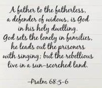 A father to the fatherless, a defender of widows is God in his holy dwelling. God sets the lonely in families . . . (Psalms 68:5-6).